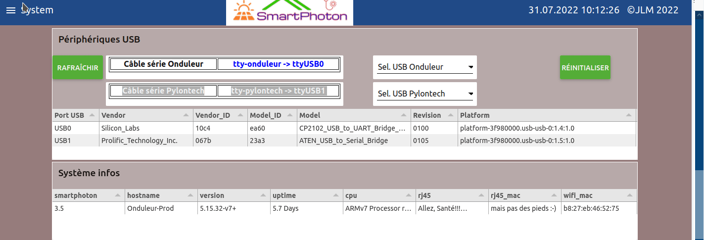 - Brancher le 1er câble USB, celui qui par exemple est branché à l’onduleur, aller dans le menu System et relever quel port USB Linux lui à assigné. Utiliser le bouton « Sel. USB Onduleur » et ‘valider’